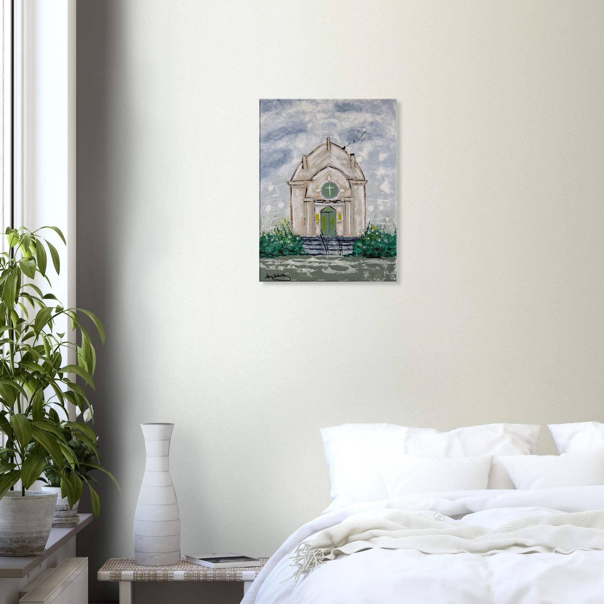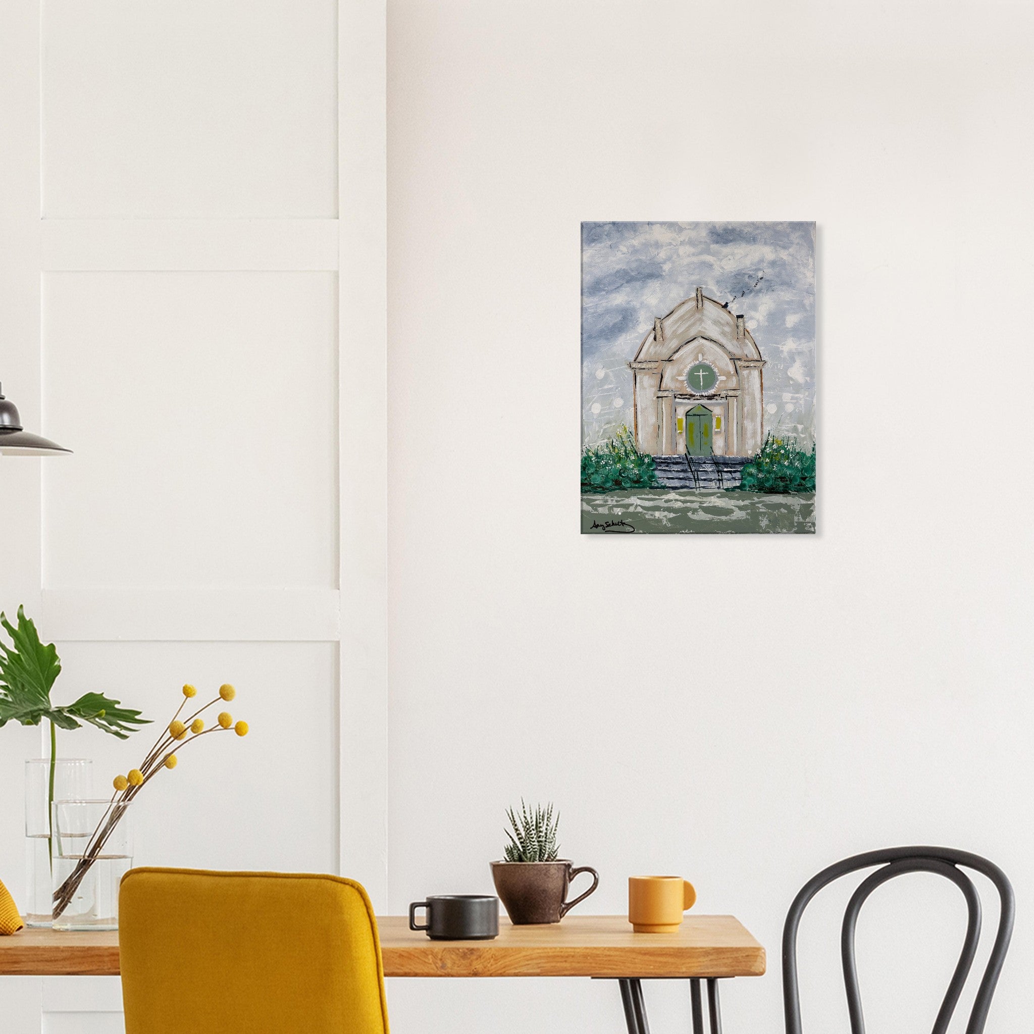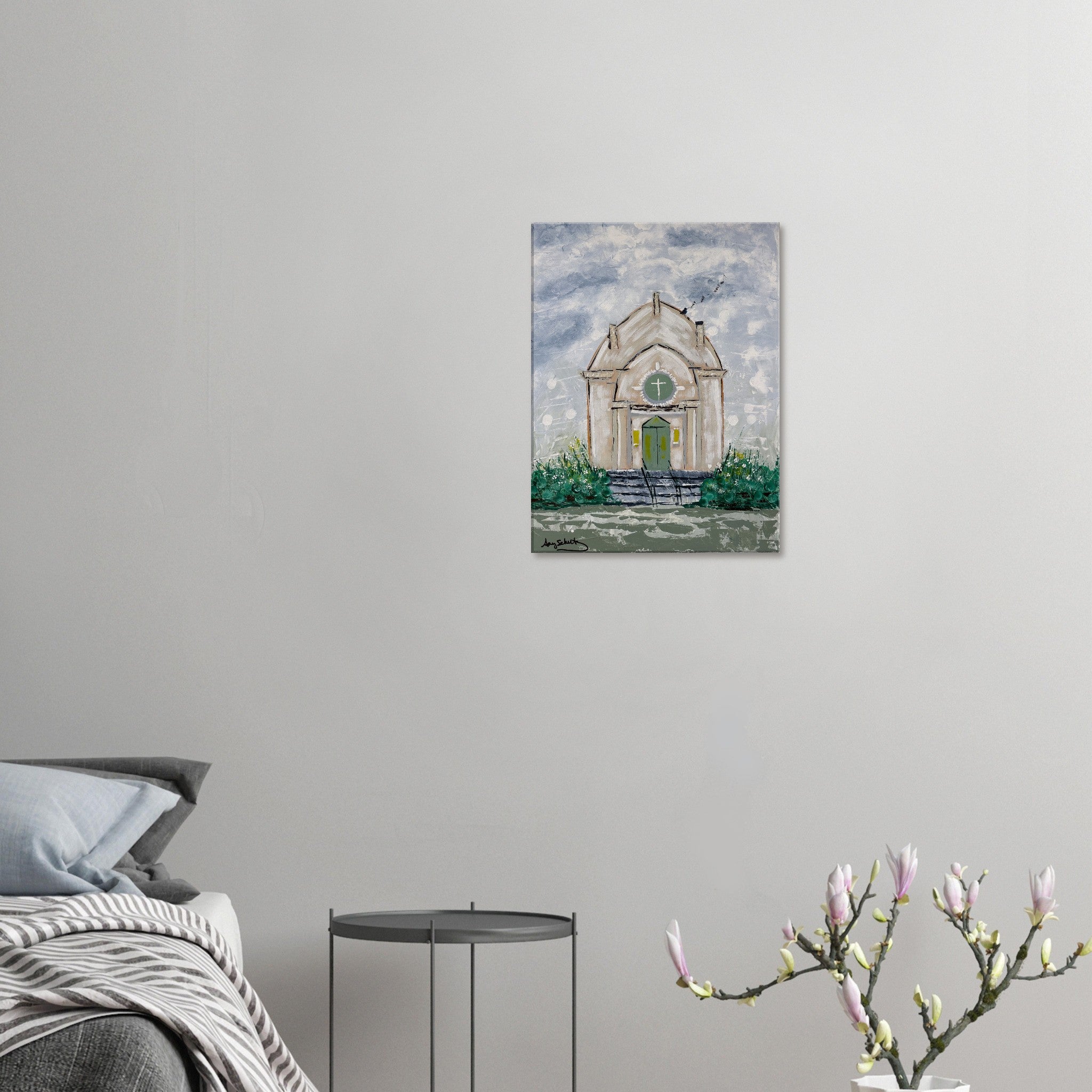 This whimsical painting was inspired by a friend’s childhood memory and captures the beauty of childlike faith through the image of a small historic neighborhood church in Pennsylvania. As young girls, she and her sister felt gently led by the Lord to that little church—where they first heard the good news, the gospel of Jesus Christ. The soft, cloudy sky, dotted with light, creates a dreamlike atmosphere, while loose, playful brushstrokes hint at the innocence of memory. The church’s gentle green door and a white cross above draw the viewer inward, and the lush bushes bursting with textured greens and whites give the scene a sense of life and joy. At the top, a tiny blue bird perches on the roofline, lifting a song to the heavens of “Holy, Holy, Holy,” symbolizing the sweetness and purity of hearing God’s voice for the first time.
