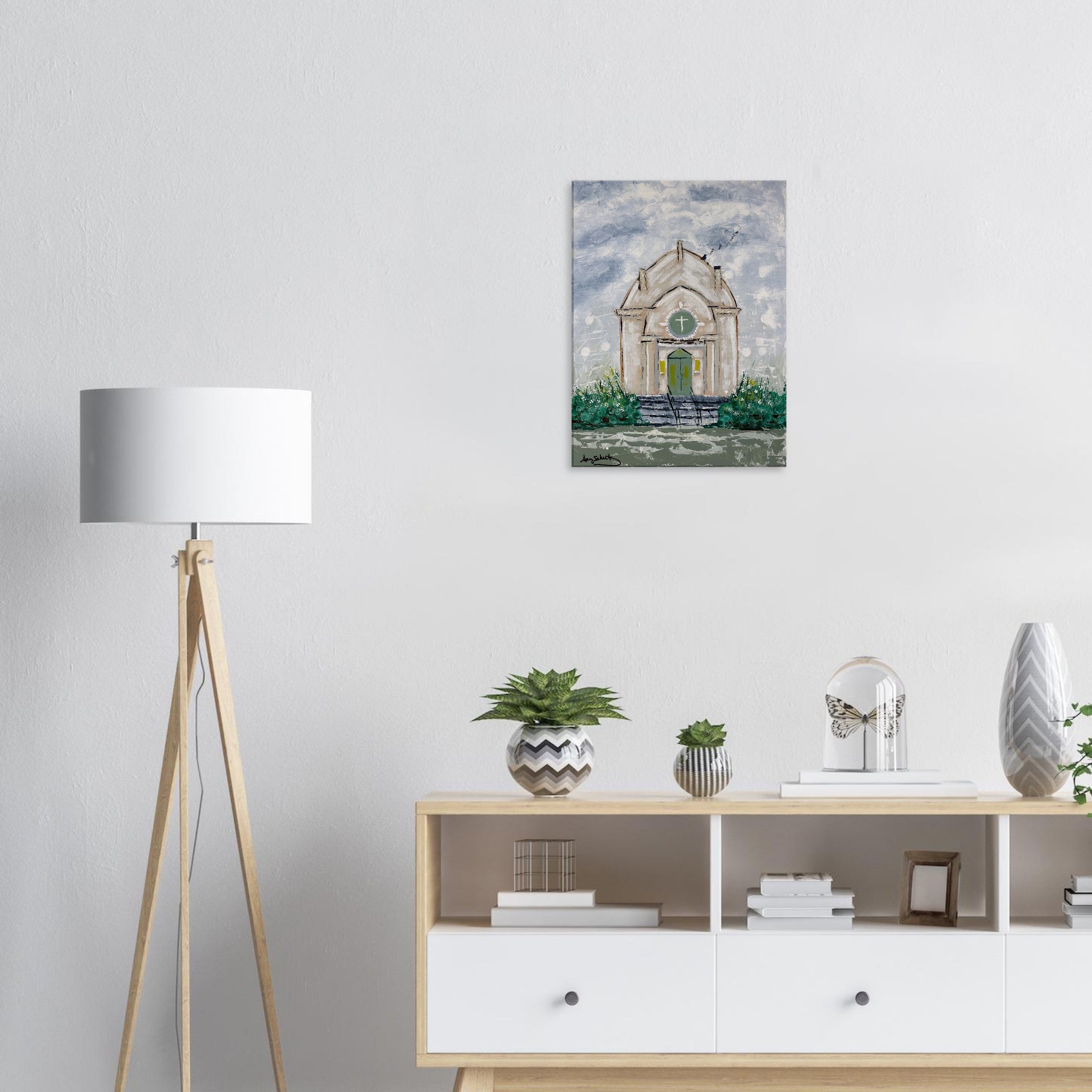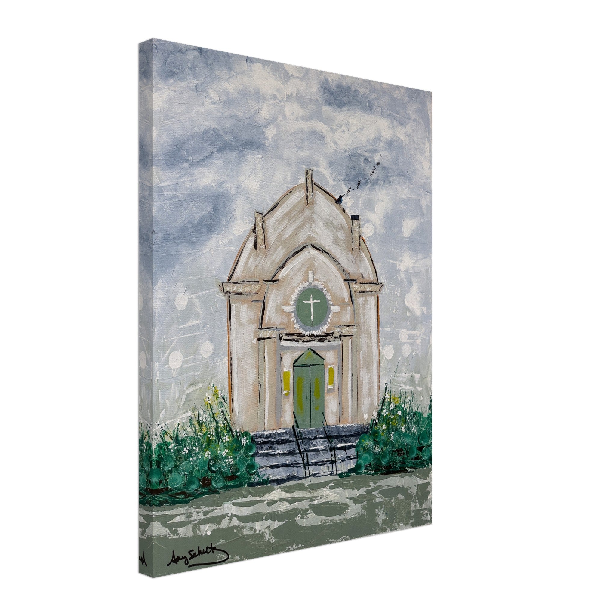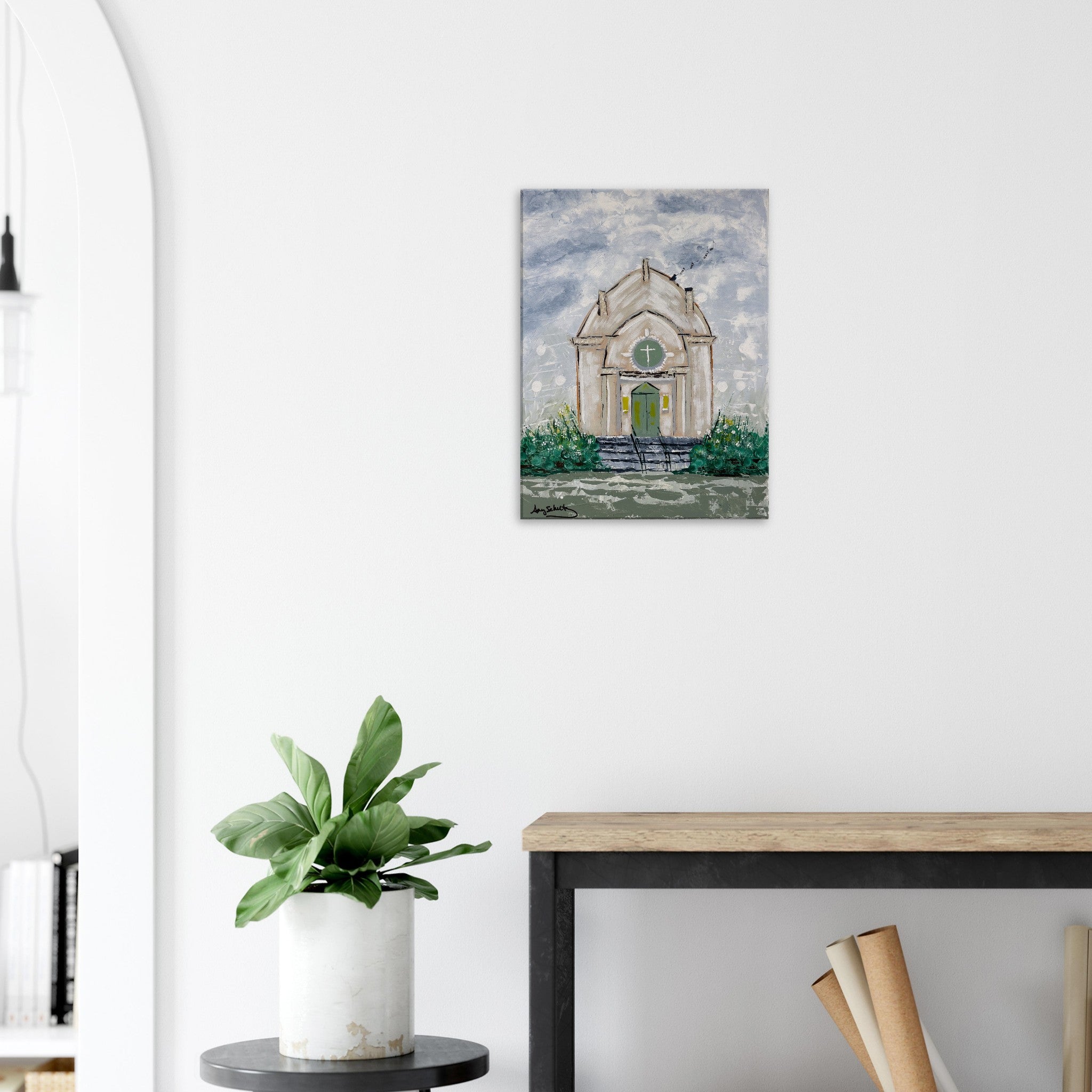This whimsical painting was inspired by a friend’s childhood memory and captures the beauty of childlike faith through the image of a small historic neighborhood church in Pennsylvania. As young girls, she and her sister felt gently led by the Lord to that little church—where they first heard the good news, the gospel of Jesus Christ. The soft, cloudy sky, dotted with light, creates a dreamlike atmosphere, while loose, playful brushstrokes hint at the innocence of memory. The church’s gentle green door and a white cross above draw the viewer inward, and the lush bushes bursting with textured greens and whites give the scene a sense of life and joy. At the top, a tiny blue bird perches on the roofline, lifting a song to the heavens of “Holy, Holy, Holy,” symbolizing the sweetness and purity of hearing God’s voice for the first time.